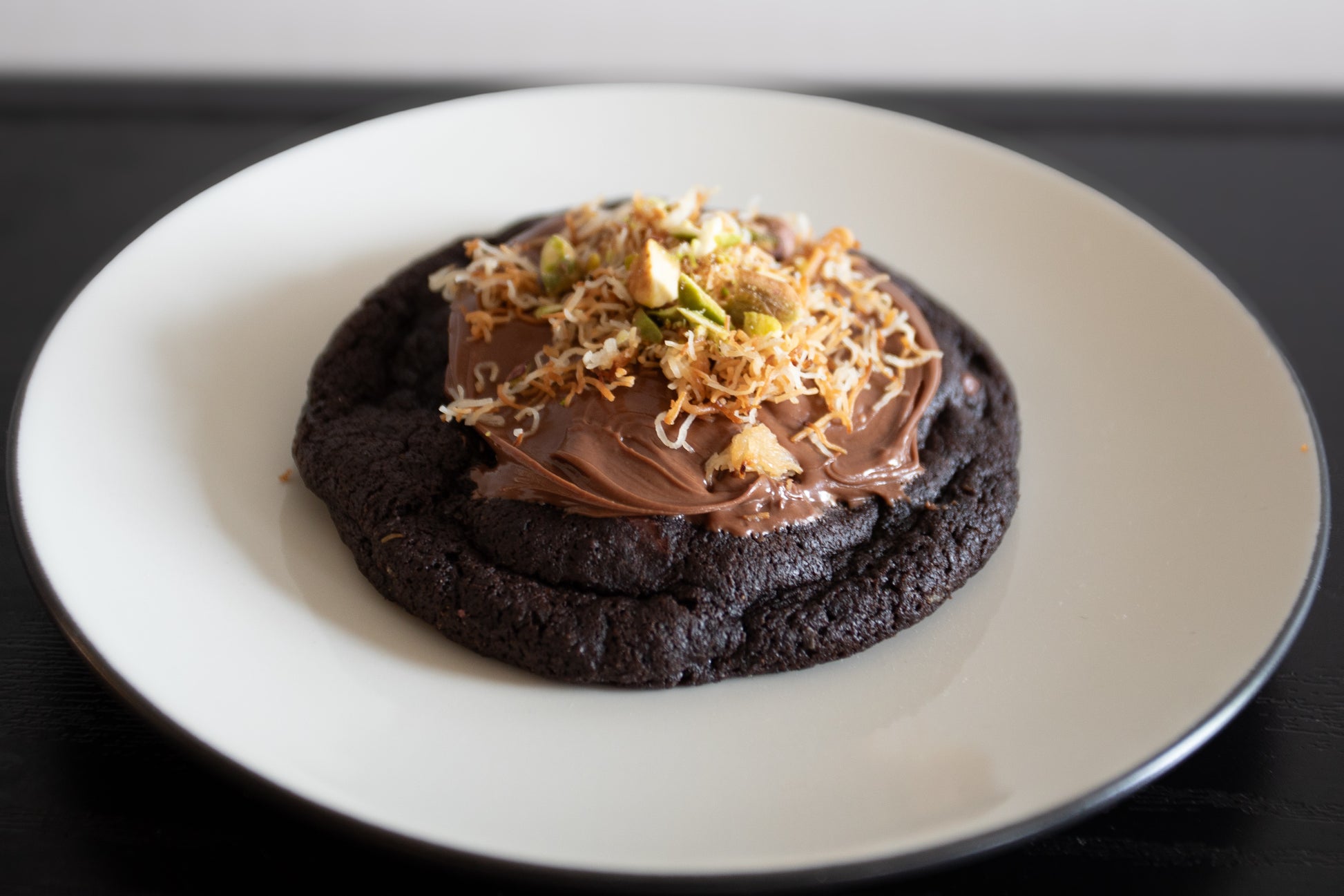 Indulge in our deeply rich, super chocolaty Dubai-inspired cookie, generously stuffed with nutella and topped with more nutella, toasted katifi and pistachios. This treat combines crunchy, nutty textures with intense chocolate flavor for an unforgettable bite.